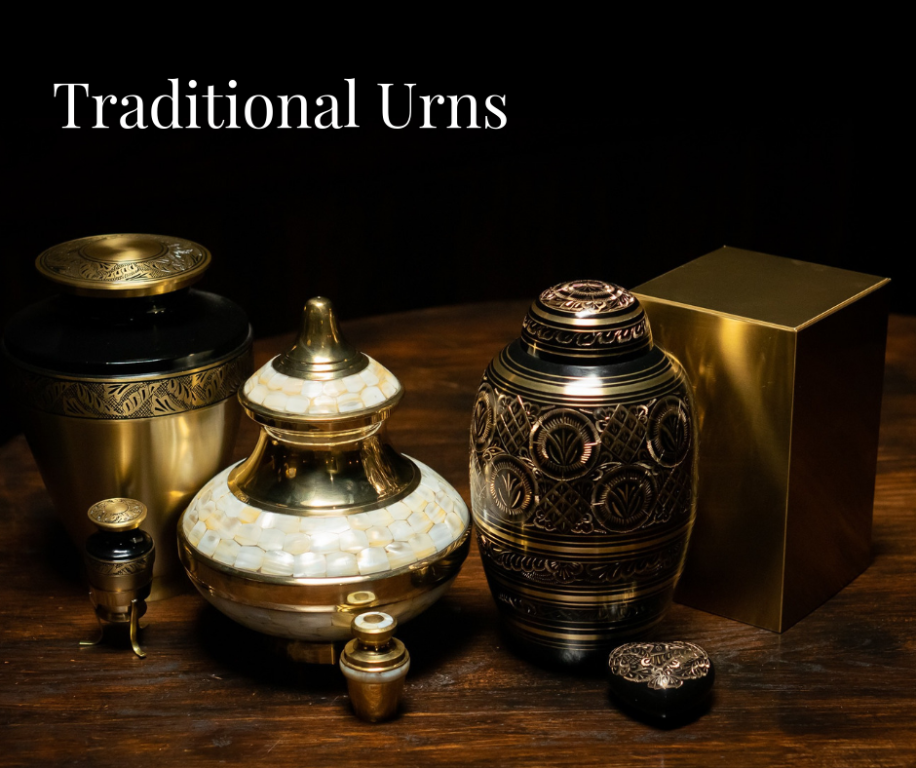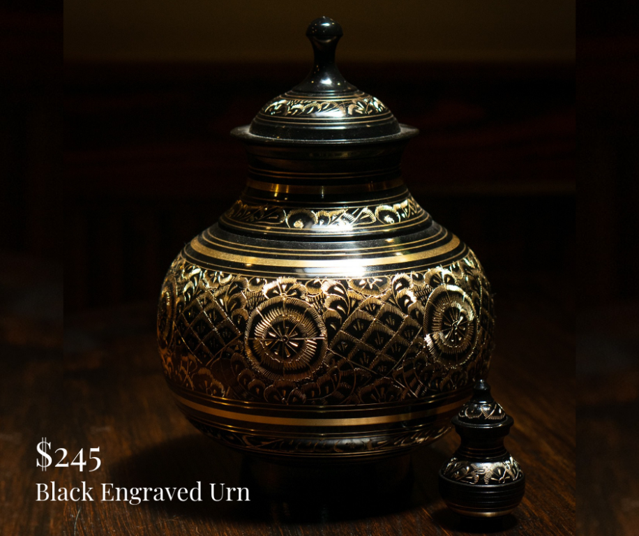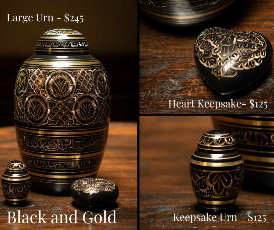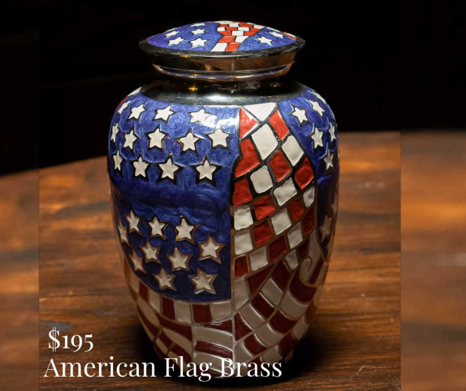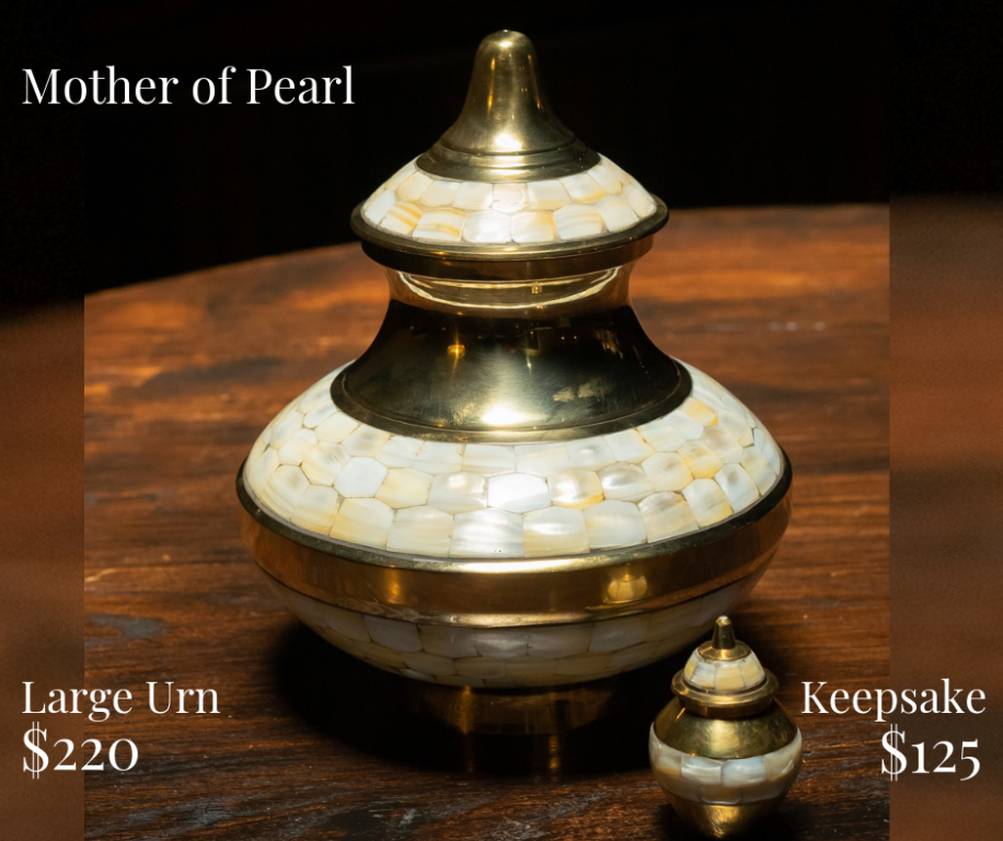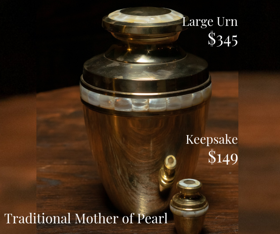 Our traditional urns make for lovely display pieces and are beautiful reminders of those we have lost. Choose from our selection of elegant urns, like the Mother of Pearl urn at the low price of $220.00 or the American Flag Brass urn for only $195.00. Additionally, we offer smaller urn options, like the intricate Black and Gold Heart Keepsake for only $125.00.