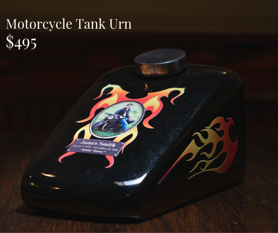 Keep their memory alive with our selection of personalized urns in many themes and styles. This unique collection, which includes the Motorcycle Tank Urn for $495.00, the Tall Cat Urn for $245.00 and the Art Glass Eternal Flame Urn for $595.00, embodies the personality, passions and hobbies of our loved ones.